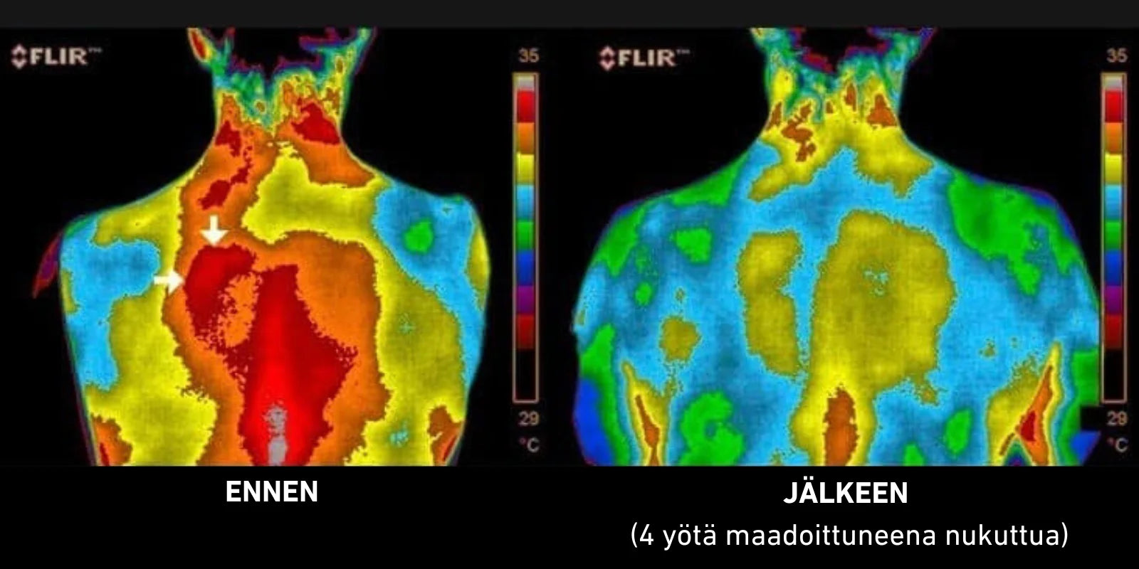 Kuvassa vasemmalla on keskiselän ja hartioiden alue, joka on otettu lähtötilanteena (ennen kliinistä maadoittumista). Nuolilla on merkitty merkittävimmät tulehdusalueet, jotka vastaavat täsmälleen koehenkilön valituksen kohteita. Oikeanpuoleinen kuva on otettu 4 yötä kliinisellä maadoitusalustalla nukkumisen jälkeen. Huomaa tulehduksen täydellinen häviäminen ja normaalin lämpösymmetrian palautuminen.