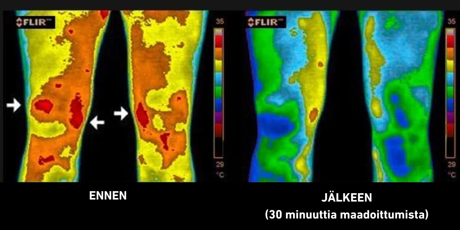 Ylempi rivi kuvia on otettu polvista ennen ja jälkeen 30 minuutin altistumisen kliiniselle maadoitukselle. Nuolilla on merkitty merkittävimmät tulehdusalueet. Tulehdus on laskenut huomattavasti oikeanpuoleisessa kuvassa, joka on otettu 30 minuutin kliinisen maadoituksen jälkeen. Alempi kuva on otettu ennen hoitoa. Kuvassa näkyy normaalin lämpösymmetrian palautuminen ja merkittävä tulehduksen väheneminen.