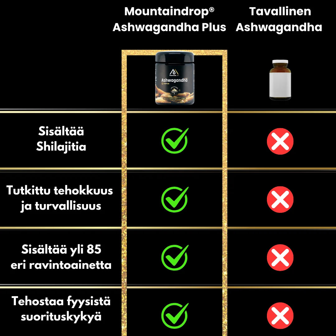 Mountaindrop® Ashwagandha Plus yhdistää kolme voimakasta luonnonlahjaa tukemaan jaksamistasi ja kokonaisvaltaista hyvinvointiasi. Shilajit vahvistaa henkistä ja fyysistä suorituskykyä, kun taas puhdas Ashwagandha KSM-66® auttaa vähentämään stressiä ja parantamaan unenlaatua. Raaka kastanjahunaja täydentää tämän tehokkaan yhdistelmän sen antioksidanttisten ja tulehdusta vähentävien ominaisuuksien ansiosta.