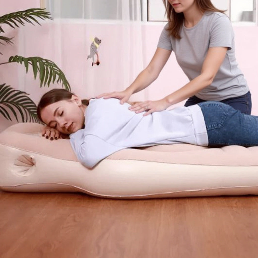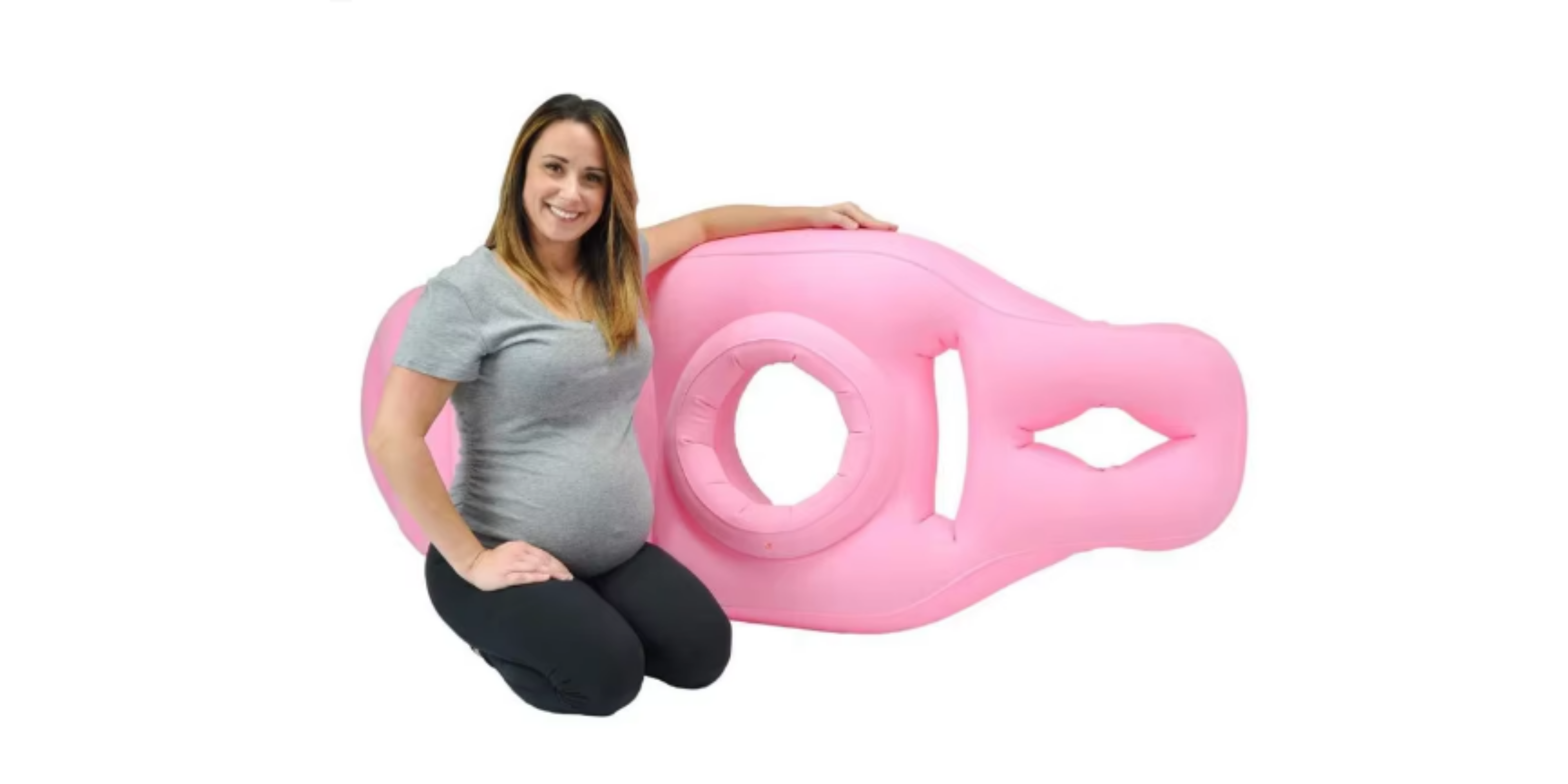 TummyCloud on täytettävä ilmapatja, jonka ansiosta pystyt vihdoinkin makaamaan vatsallasi turvallisesti ja samalla lepuuttamaan alaselkääsi ja lantiotasi. Patjan keskellä oleva aukko on suunniteltu tukemaan raskausvatsaa.